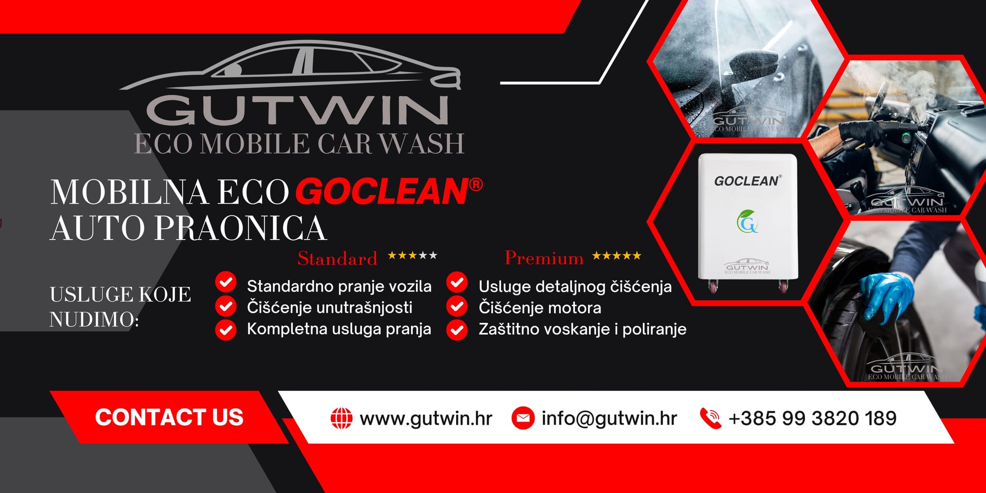 GUTWIN - GOCLEAN® Mobilna Eco Autopraonica Rijeka koristi najnoviju tehnologiju za čišćenje vozila, pružajući uslugu direktno na vašoj lokaciji. Korištenjem visokotlačne pare, omogućavamo visokoučinkovito čišćenje i dezinfekciju vaših vozila, bez upotrebe kemikalija. Ovaj ekološki prihvatljiv pristup osigurava dubinsko čišćenje uz minimalan utjecaj na okoliš.